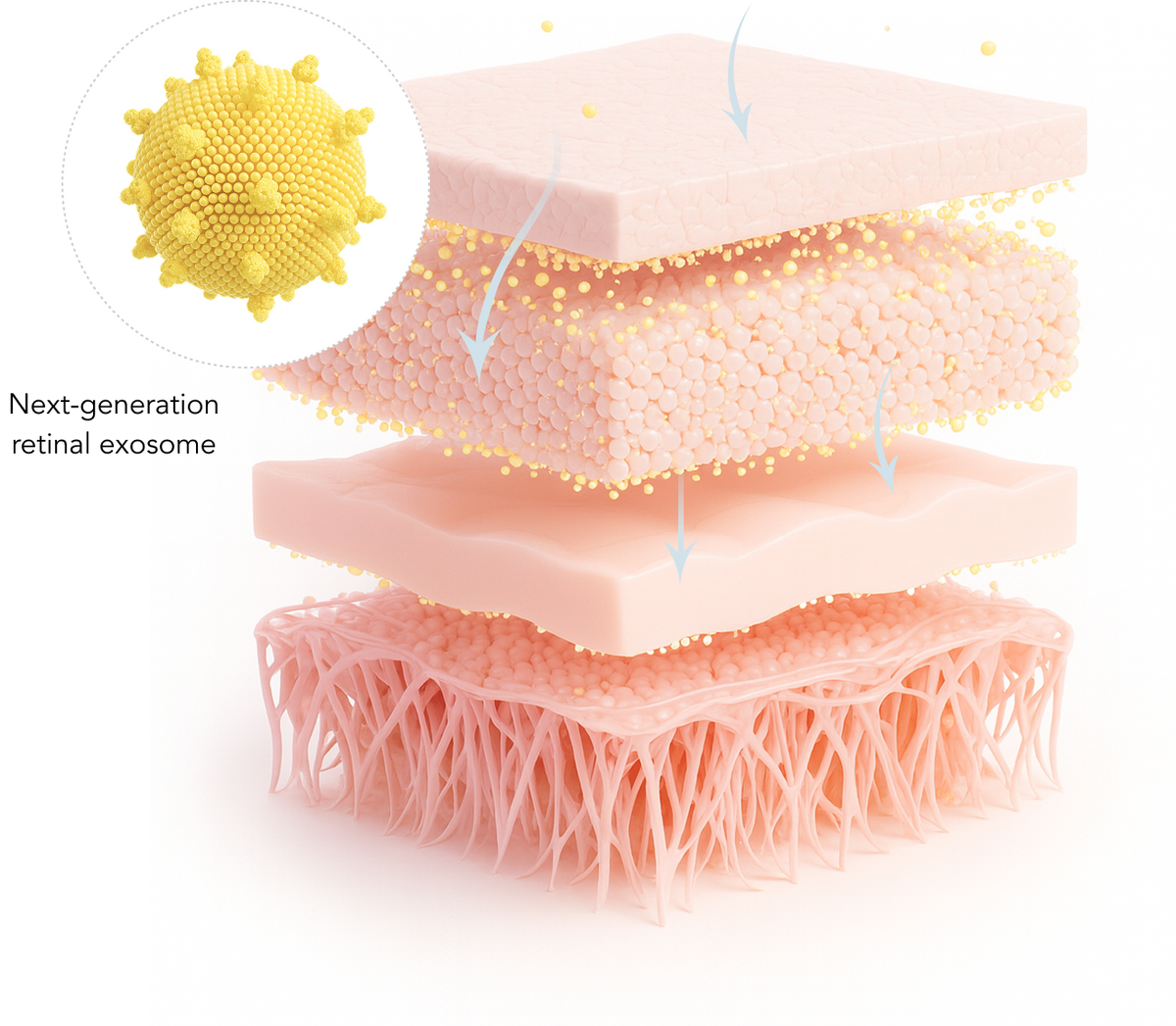 Our proprietary RetaXome™ Technology encapsulates stabilized retinal in a biomimetic exosome to protect potency and deliver it deep into the skin. This advanced system supports cell turnover, stimulates collagen and elastin, and delivers visible renewal — without irritation.